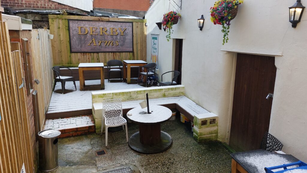 When entering the pub you are welcomed with a cosy and friendly feel with modern décor. To the right you will find a snug area with fitted seating, TV and a featured cast iron log burner for those colder months, behind the snug there is a further seating area with a TV to show live sporting events. To the left you will find a fixed seating area with tables and stools which leads to a games room currently housing a pool table, juke box, games machine and darts board. The bar can be viewed as soon as you walk in and services all sections of the pub and has an excellent display. Throughout the pub there are exposed brick pillars in keeping with the modern rustic atmosphere the Derby Arms oozes. The beer garden is accessed via the snug where you will find a courtyard area with smoking solution and a raised decked area providing external drinking.