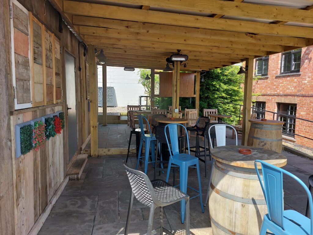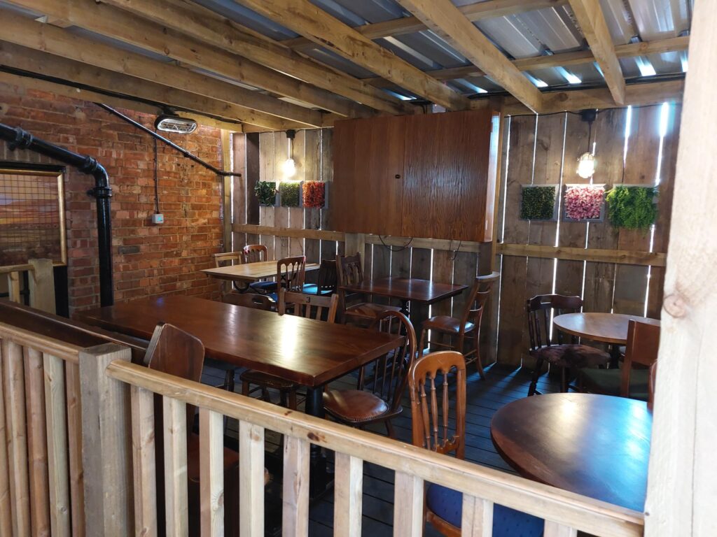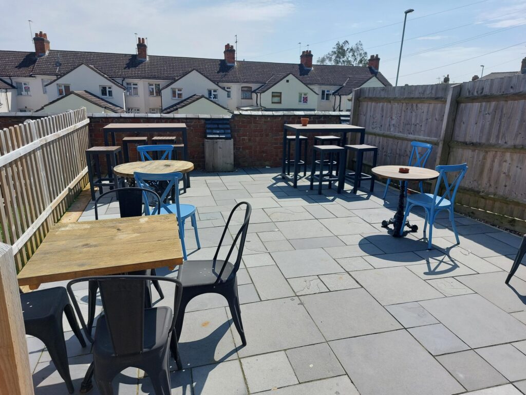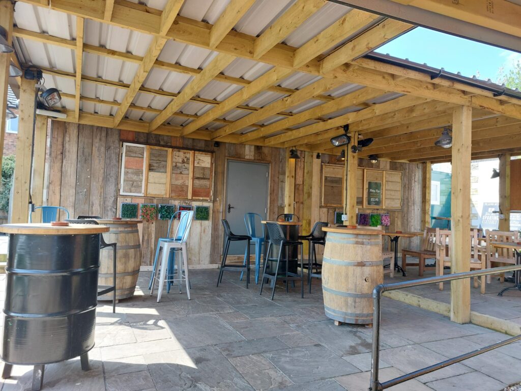 The area in front of the very useful outside bar is covered, so can be used 365 days a year. The garden area is large and can seat 60+ people.